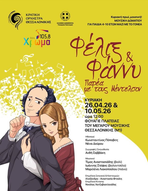 Την διπλή πρόσκληση για την παράσταση Φέλιξ & Φάννυ (Παρέα Με Τους Μέντελσον), η οποία θα πραγματοποιηθεί σήμερα Κυριακή 26 Απριλίου στις δώδεκα το μεσημέρι, στο Φουαγιέ της Πλατείας του Μεγάρου Μουσικής Θεσσαλονίκης (Μ1). Χορηγός Επικοινωνίας είναι ο Χρώμα 105.8, κέρδισε: